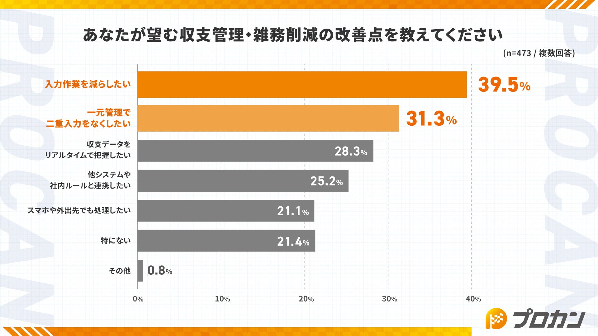 案件収支管理を行っている方に具体的な改善点をたずねたところ、「入力削減(39.5%)」と「一元管理(31.3%)」が上位に挙がりました。入力作業やデータ管理の煩雑さが課題となっており、システム連携や入力処理の自動化の活用が有効と考えられます。こうした効率化が進めば、雑務を減らして本業に集中できる環境が整い、企業の競争力回復や事業成長にもつながる可能性があります。