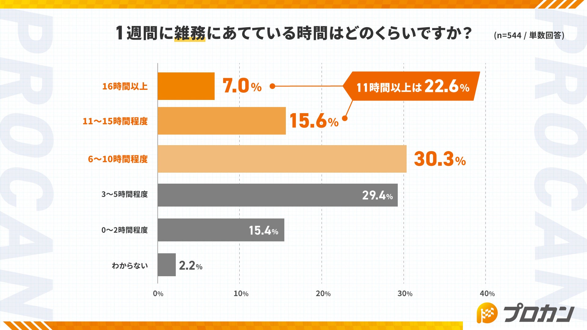 次に、1週間に雑務にあてている時間はどれくらいなのかたずねると、「週6〜10時間」が最多であり、さらに20%以上が「11時間以上」と回答しました。