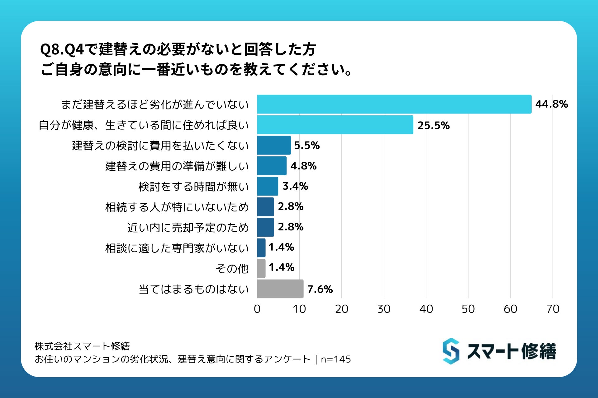 建替えの必要性を感じない方に対して「ご自身の意向に一番近いものを教えてください」と質問したところ、最も多かった回答は「まだ建て替えるほど劣化が進んでいない」(44.8%)であり、次いで「自分が健康で生きている間に住めれば良い」(25.5%)という結果となりました。この結果から、現状の建物の状態に加え、回答者の年齢層が高いため、現状維持を重視する傾向が強いことが伺えます。