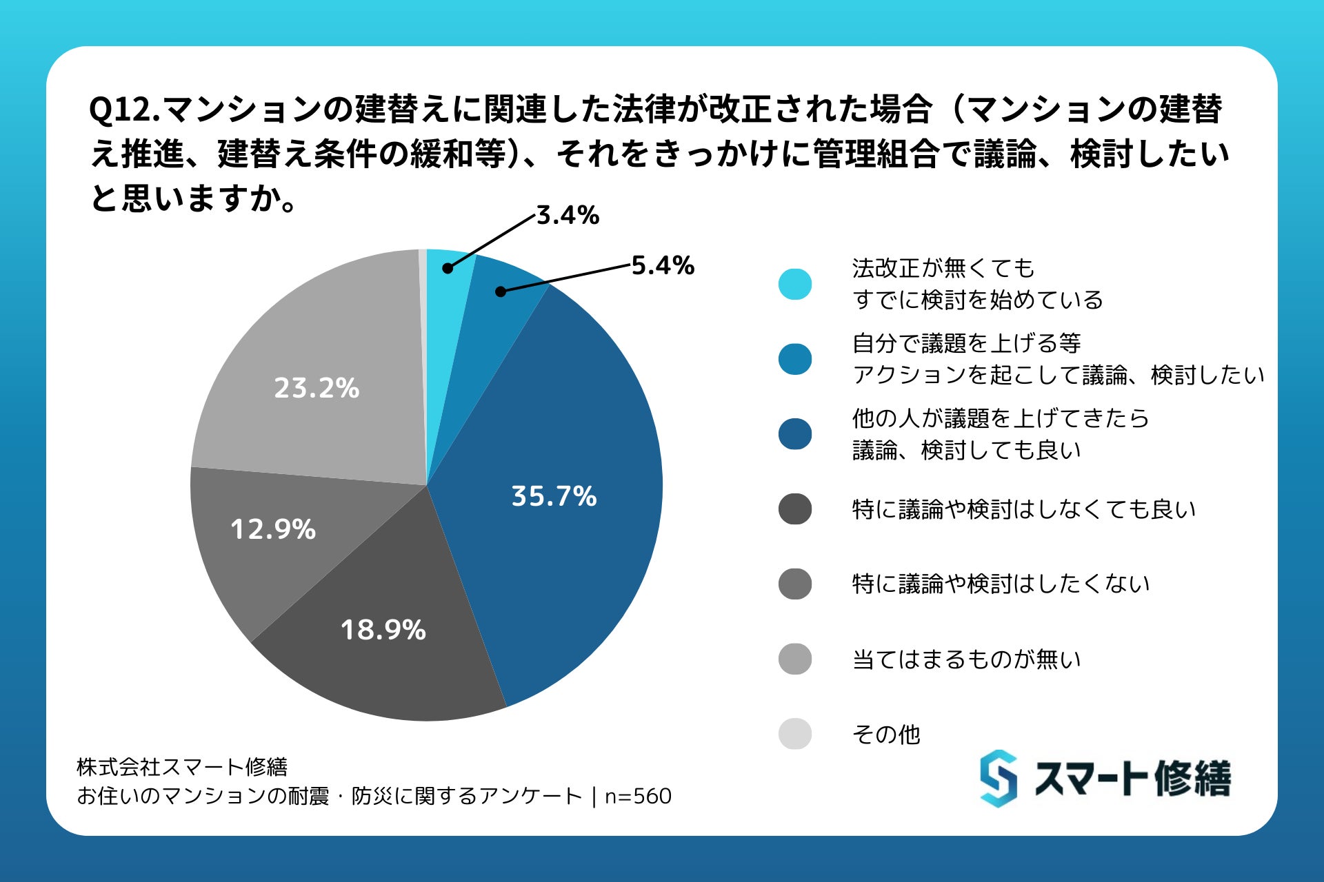 また、「マンションの建替えに関連した法律が改正された場合(マンションの建替え推進、建替え条件の緩和等)、それをきっかけに管理組合で議論、検討したいと思いますか。」との質問に対しては、「自分で課題を上げる等アクションを起こして議論、検討したい」「他の人が議題を上げてきたら議論、検討しても良い」と回答した人が約4割という結果になりました。これにより、法改正が建替えを進めるために一定の効果があることがわかります。