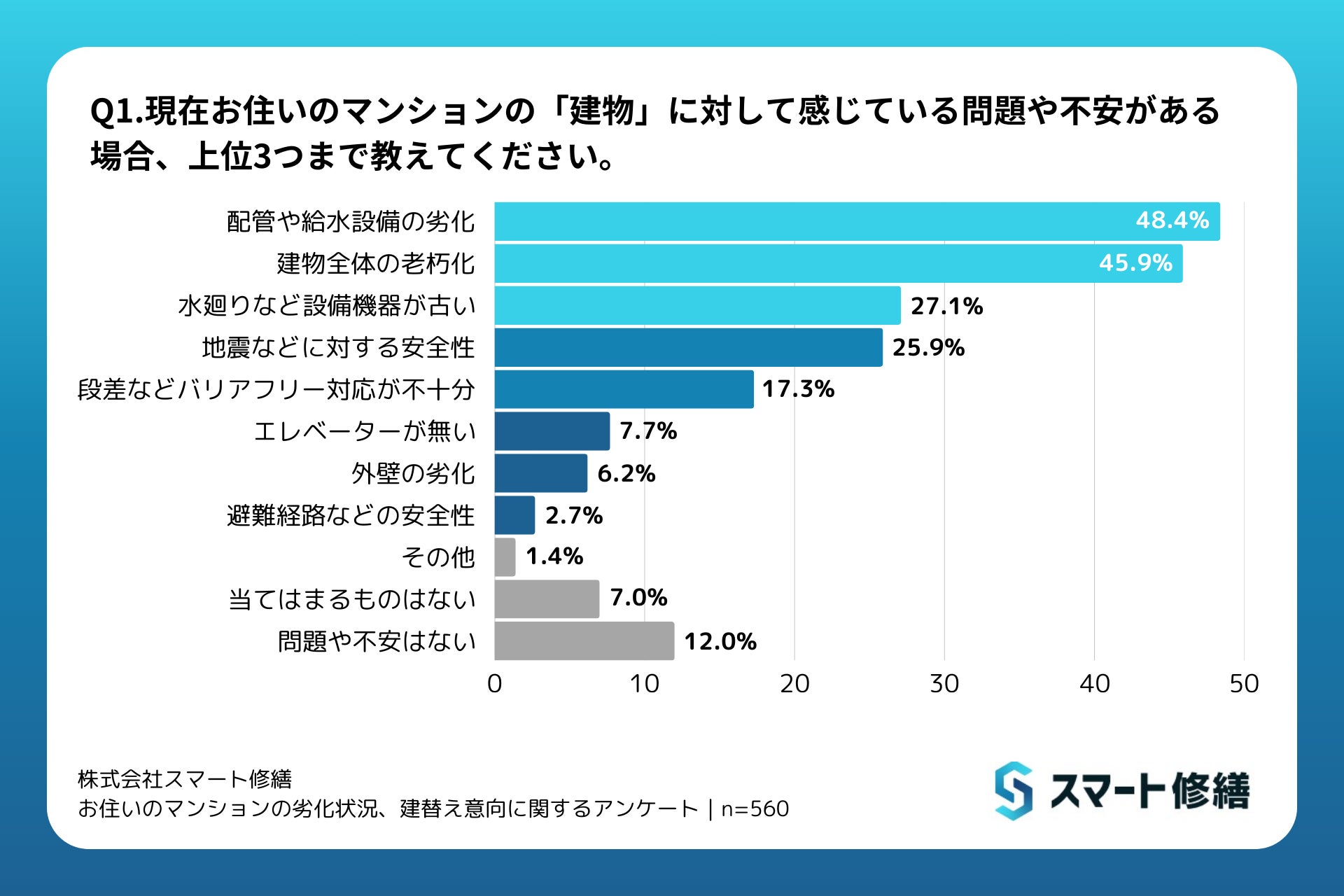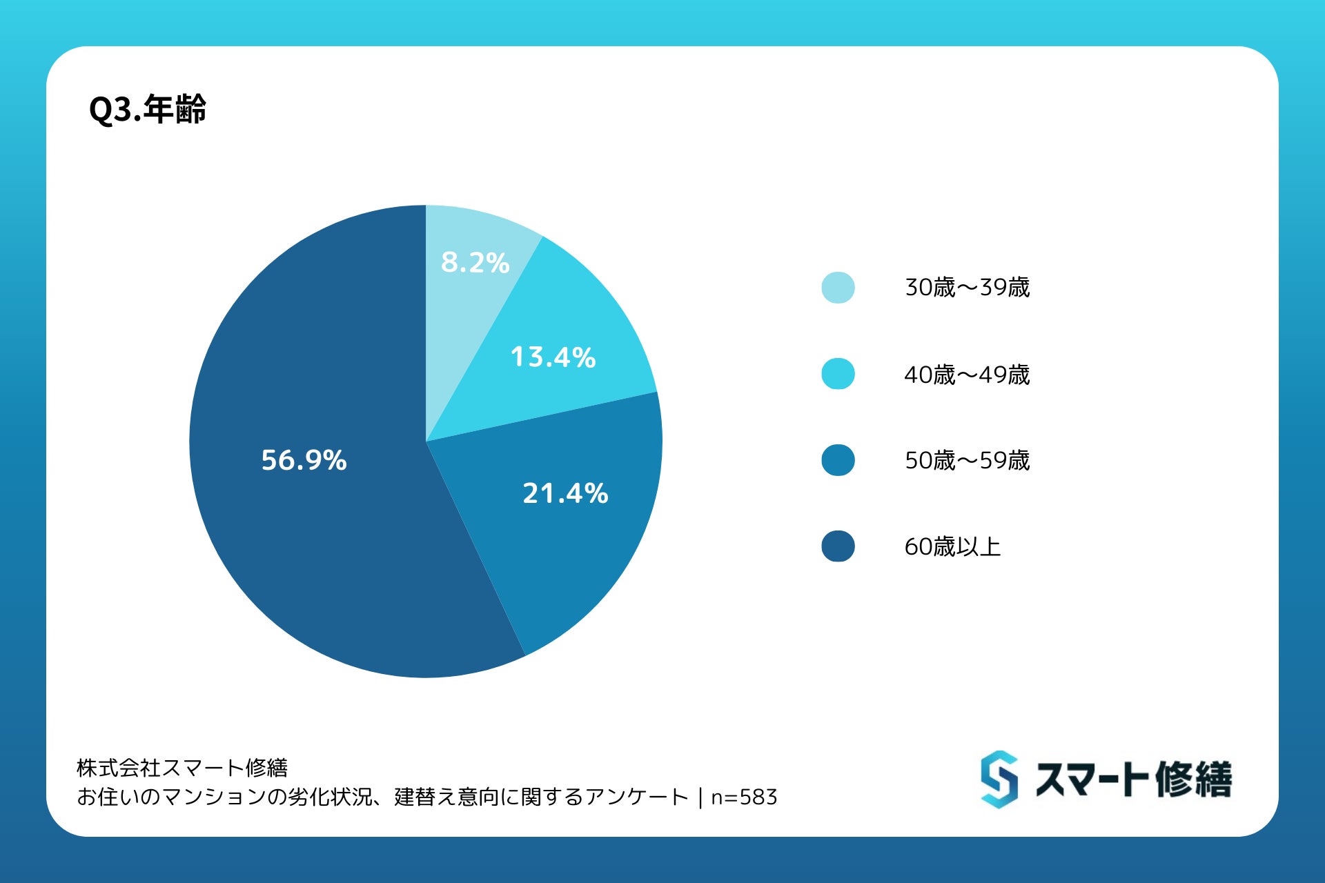 マンションやビルなど大型建物の修繕工事の見積、工事支援サービスを展開する株式会社スマート修繕(本社:東京都港区)は、築30年以上のマンション区分所有者を対象に、お住いのマンションの劣化状況、建替え意向に関するアンケート調査を実施しました。