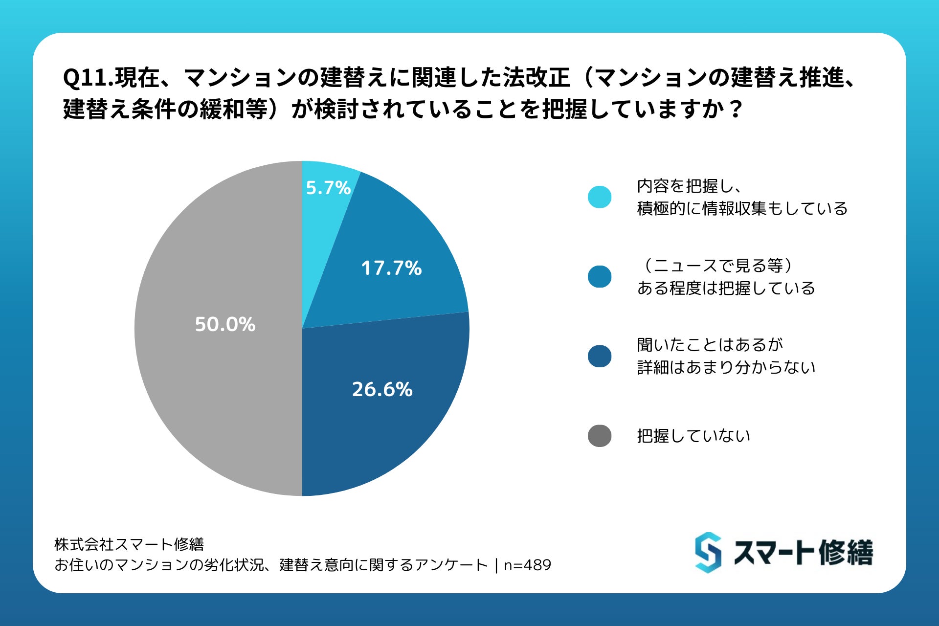 「現在、マンションの建替えに関連した法改正(マンションの建替え推進、建替え条件の緩和等)が検討されていることを把握していますか?」という質問に対し、半数の方が今回の法改正について認知しており、一定の関心が寄せられていることが伺えます。