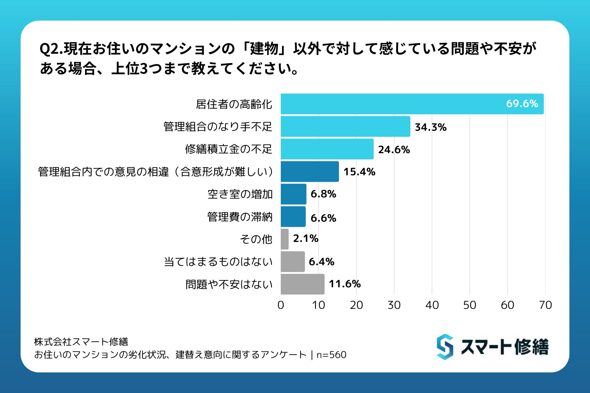 「現在お住いのマンションの『建物』以外で対して感じている問題や不安がある場合、上位3つまで教えてください。」という質問に対しては、約7割の人が「居住者の高齢化」に課題を感じていると回答しました。続いて、「管理組合のなり手不足」(34.3%)、「修繕積立金の不足」(24.6%)が課題と感じられています。