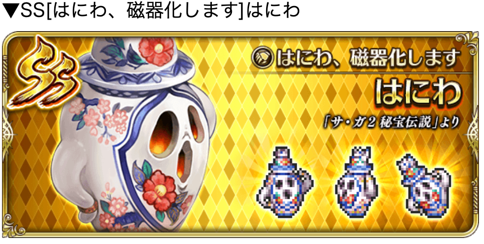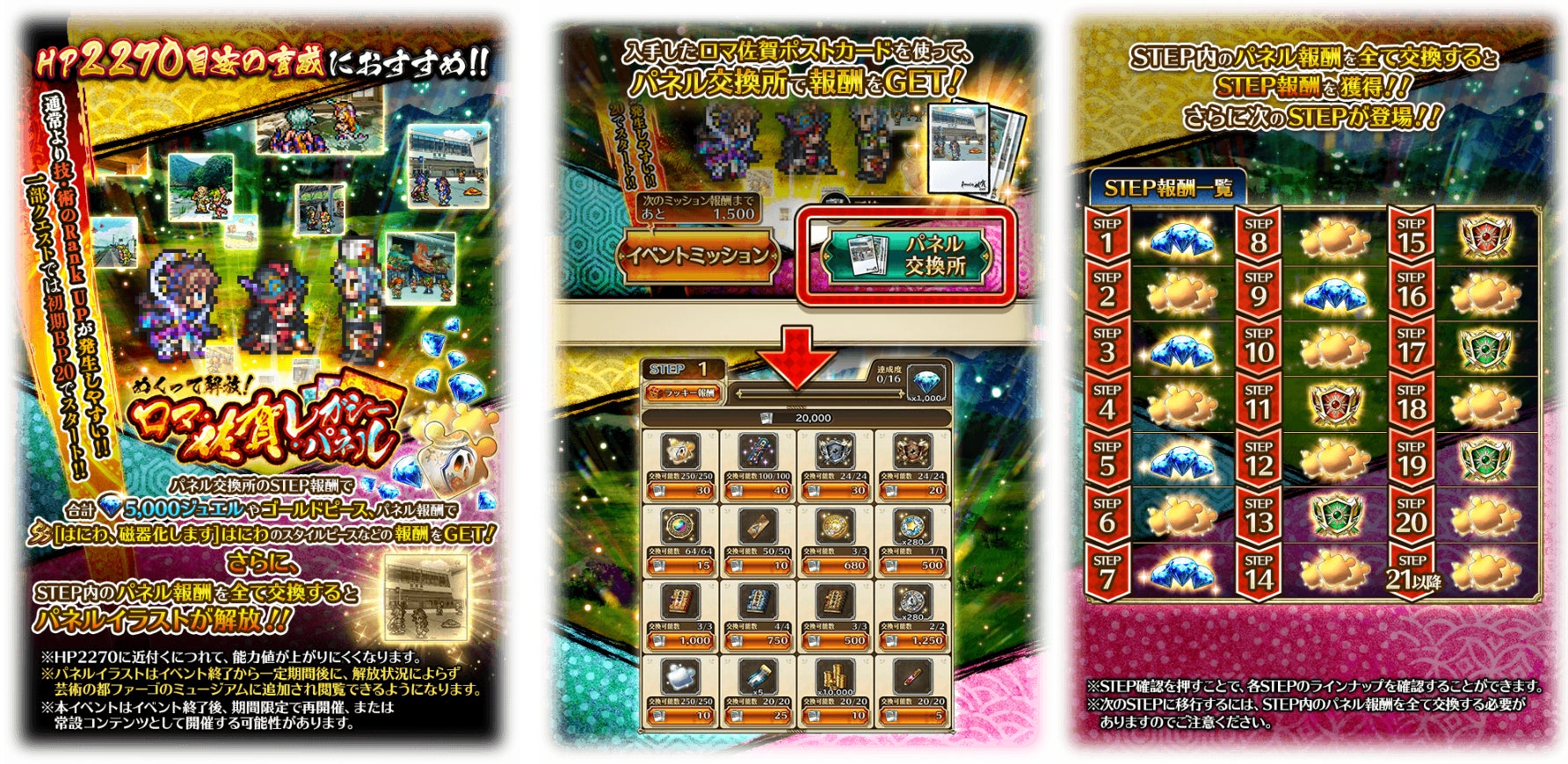 イベントに挑戦してロマ佐賀ポストカードを集め、パネルをめくっていくと合計5,000ジュエルやSS[はにわ、磁器化します]はにわのピース(250枚でSS[はにわ、磁器化します]はにわを召喚可能)などが獲得できます。
