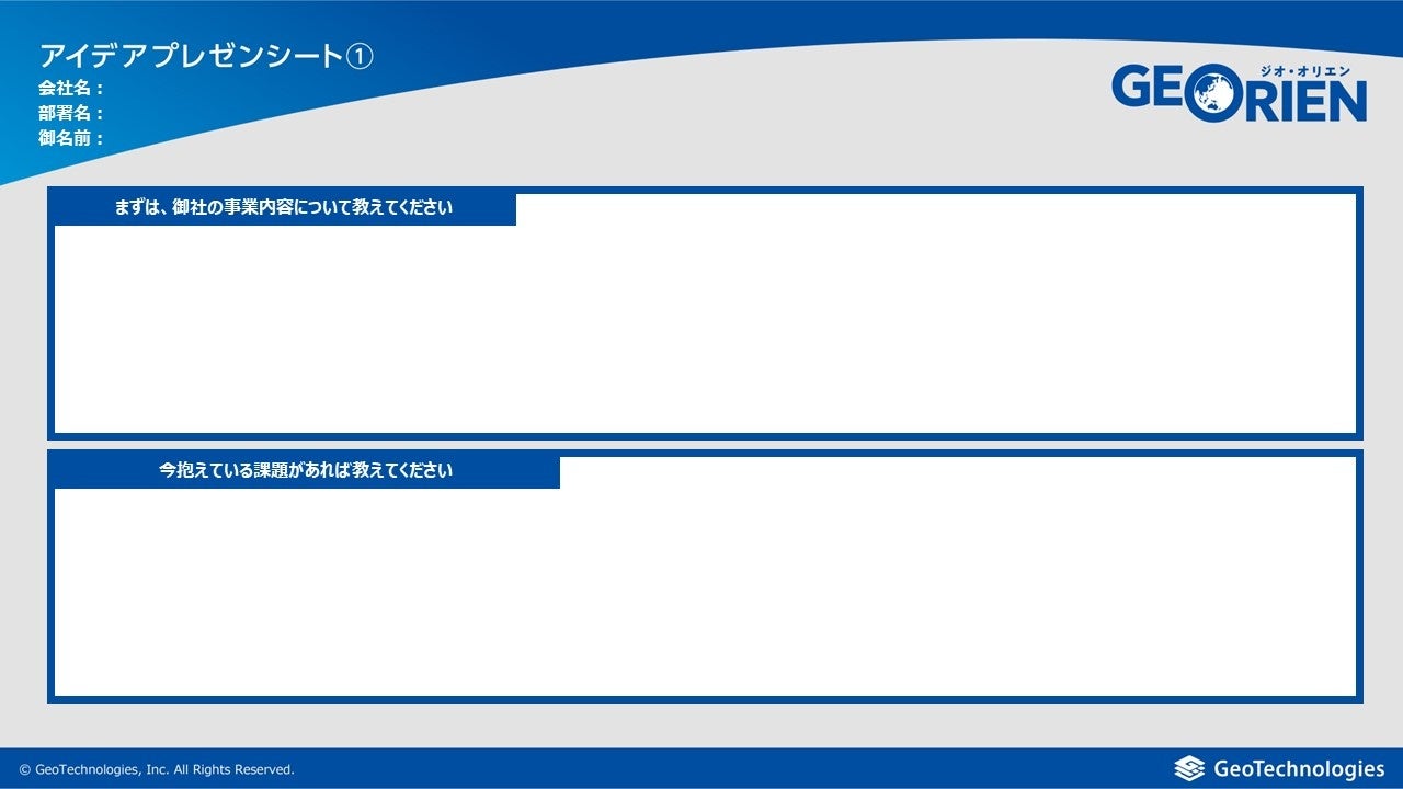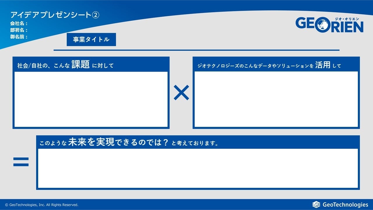 「ジオ・オリエン」は、デジタル地図制作会社のジオテクノロジーズが持つ様々なビッグデータやソリューションを使って、企業や自治体が抱える課題を一緒に解決しようというプロジェクトです。「地球を喜びで満たそう」をミッションに掲げる当社が、人に優しい、企業に優しい、地球に優しい世界を創造するために、広く皆様から課題やアイデアを募集します。