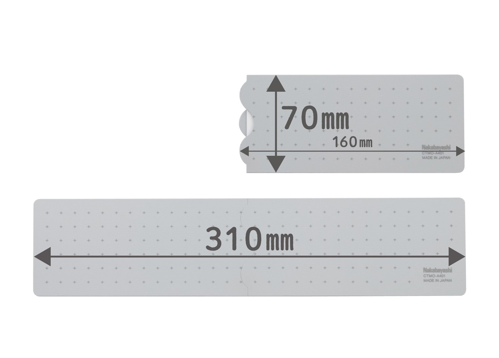 開いた時は、A4用紙(297×210mm)までのカッティング作業にちょうどよい〖ヨコ310mm×タテ70mmサイズ〗、折りたたみ時は半分の〖ヨコ160×タテ70mmサイズ〗になり、筆記用具やカッターナイフと一緒にペンケースへ収納、持ち運ぶことができます。外出先やオフィス・学校などのデスクワークで突発的に発生するカッティング作業時に活躍します。