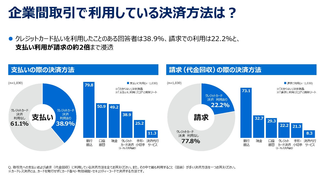 企業間取引における主な決済方法では、支払い側でのクレジットカード利用が請求側の約2倍となり、支払い利用が先行して浸透