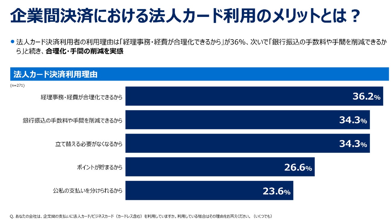 企業の法人カード利用においては、過去1年間で成長を実感している企業の約半数が活用、最も大きなメリットは業務の効率化(36.2%)