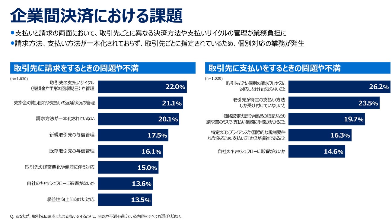 企業間決済で感じる課題として、請求時は「支払いサイクルや管理」(22.0%)、支払い時は「取引先ごとのプロセスに対応」(26.2%)といった取引先に合わせた管理業務が負担に