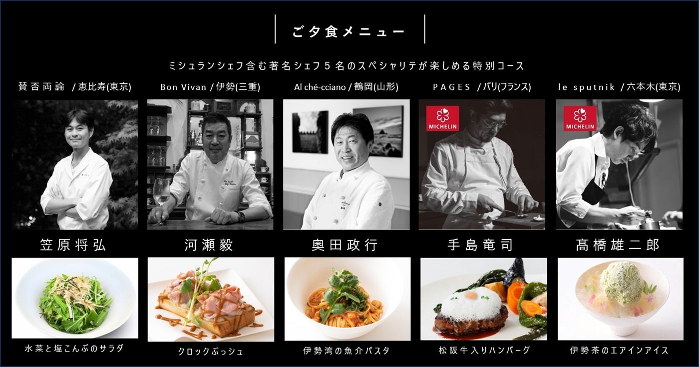 ミシュラン星付きシェフ7名を含む、全国の有名料理⼈18名が監修した“特別”をご提供。和洋中からスイーツまで、各有名シェフが織りなす芸術性あふれる料理の数々をリーズナブルにお楽しみいただけます。また、各シェフの料理には三重県産の⾷材をふんだんに使⽤しており、三重の⾷の聖地を⽬指し、三重の魅⼒をPRするガストロノミーをご体感いただける空間となっております。