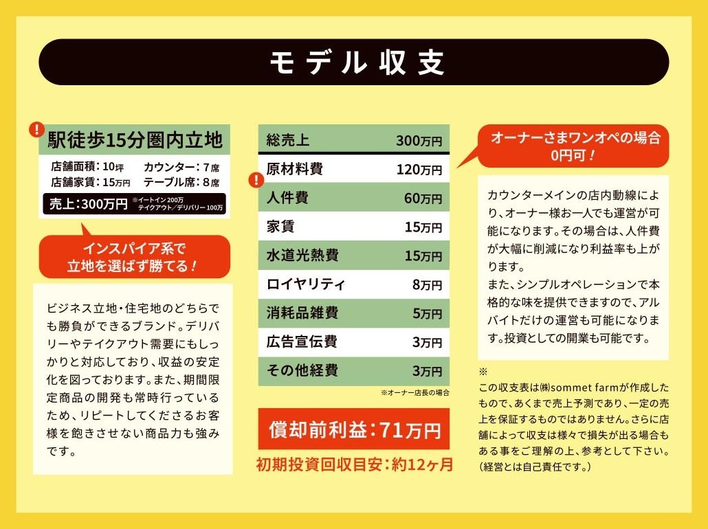 2024年の1月にオープンした新ジャンルのモデルながら、FC加盟したいとのお声が続出中!直営店実績が10坪500万円(住宅街)であることから多くの期待のお声をいただいております。特にラーメンにはないテイクアウト、デリバリー需要が高いことから業態変更のお声が非常に多くいただいております。店舗で炒めるだけのシンプルオペレーションを実現しておりますので飲食未経験でも開業が可能です!