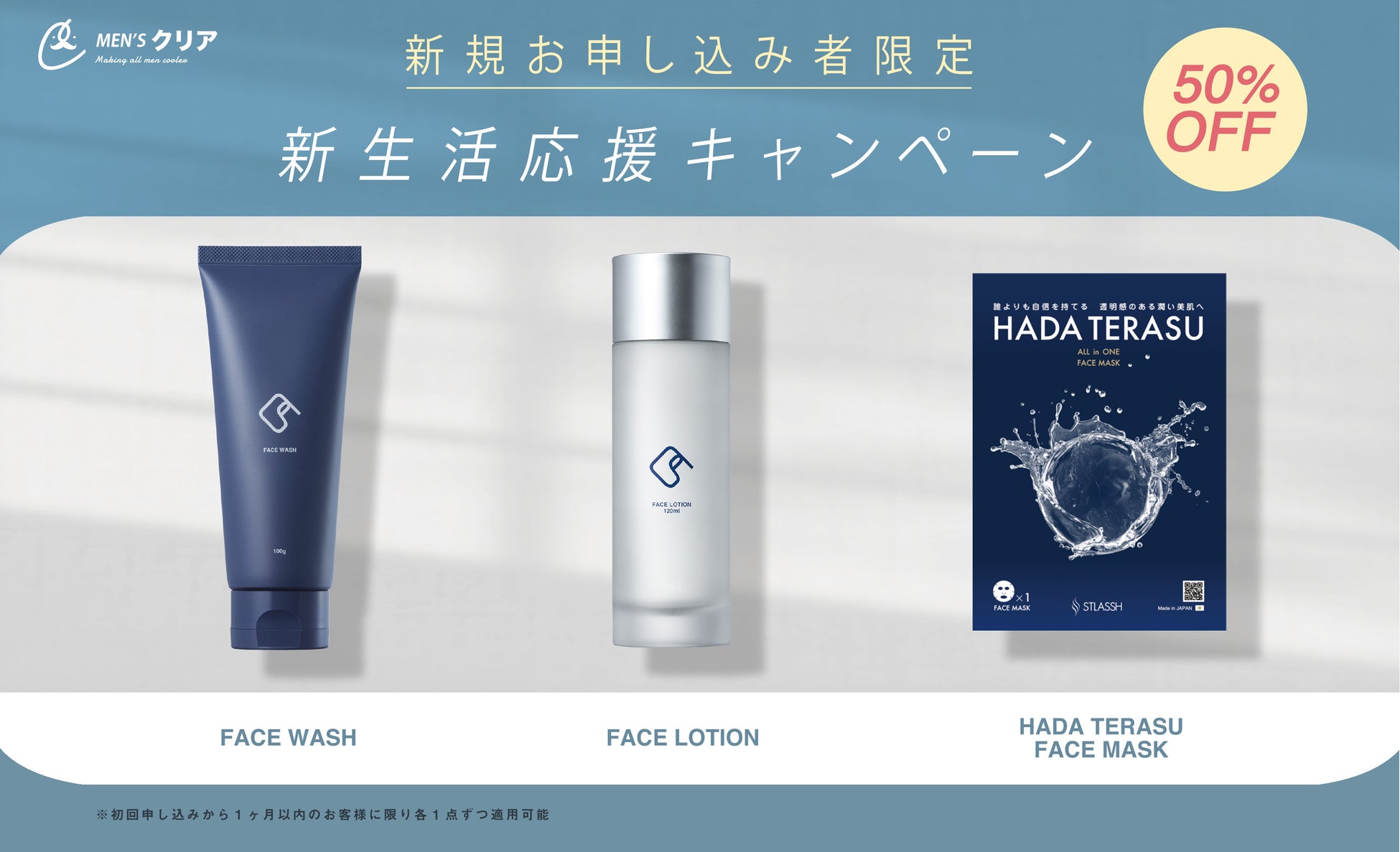 メンズクリアで新規お申し込みされた方限定で、各商品が50%OFFで購入が可能。
