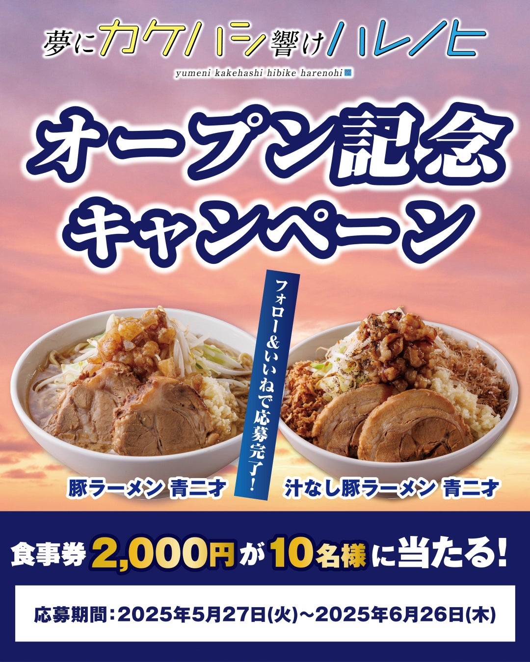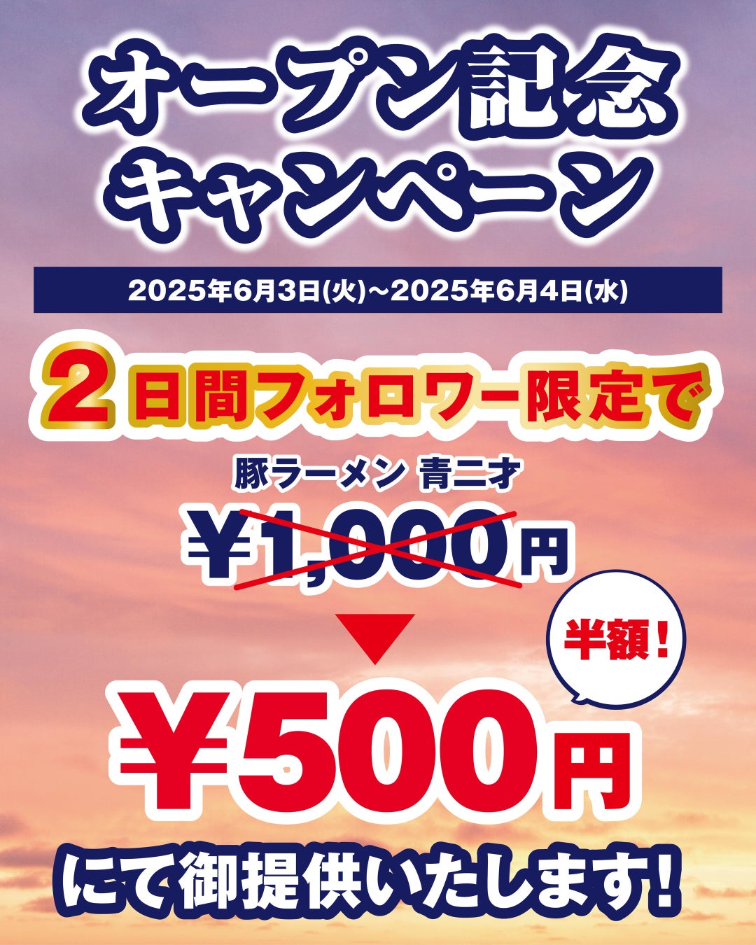 ①Instagram公式アカウントをフォローした方限定で、2025年6月3日(火)~2025年6月4日(水)の2日間で「豚ラーメン 青二才(¥1,000)」をワンコイン500円でプレゼント!