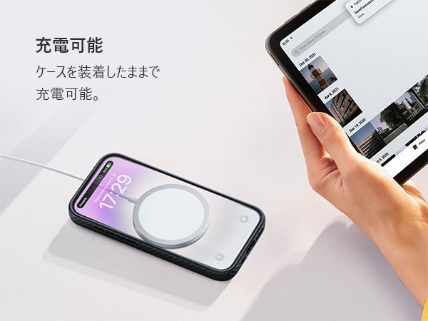 Magsafeとは、iPhone 12以降のiPhoneに内蔵されている磁石で貼り付く充電コネクタのことで、同時に非接触充電機能を指すこともあります。本スマホケースはMagsafeに対応しているため、ケースを装着したままMagsafe対応のワイヤレス充電器の利用が可能であるだけでなく、Magsafe対応のスマホリングやスマホスタンド、車載ホルダーなど、さまざまなアクセサリー製品に活用できます。