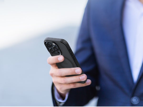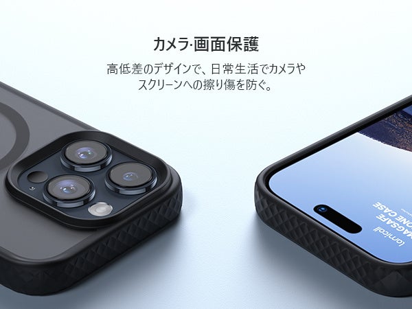 ケースのバンパー部分にはグリップ感の高いダイヤモンドテクスチャを採用しました。多層エンボス加工により手のひらにしっかり馴染むため、ケースが滑り落ちてしまう事態を防げます。バックパネル部分はマット感のあるテクスチャ。指紋防止コーティング加工を施しているため汚れが付きにくく、手に取るたびに満足感が得られます。