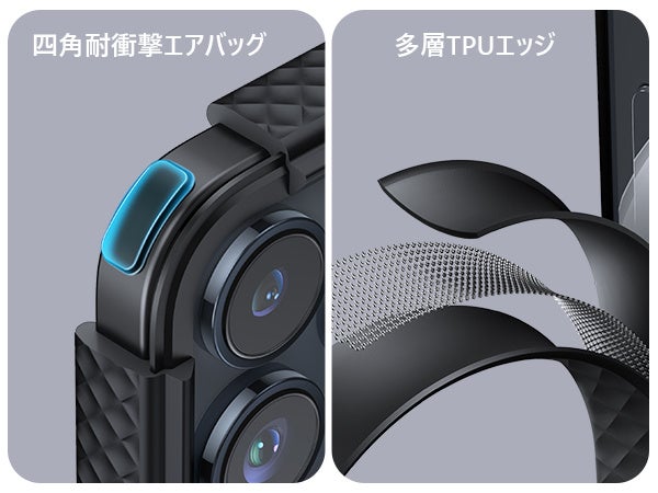 ケース素材にはTPU素材を使用しています。TPU素材は十分な柔軟性を持ちながらもシリコンよりも硬度が高く、紫外線に強いのが特徴。緩衝性に優れているため、全方位の衝撃からiPhone 15シリーズを守ります。エッジ部分には衝撃を吸収するエアガードコーナーを搭載しました。角から落下した場合も、高い弾性によりスマホをしっかり保護します。もう、落としたりぶつけたりしても、慌ててスマホの無事を確認する必要はありません。
