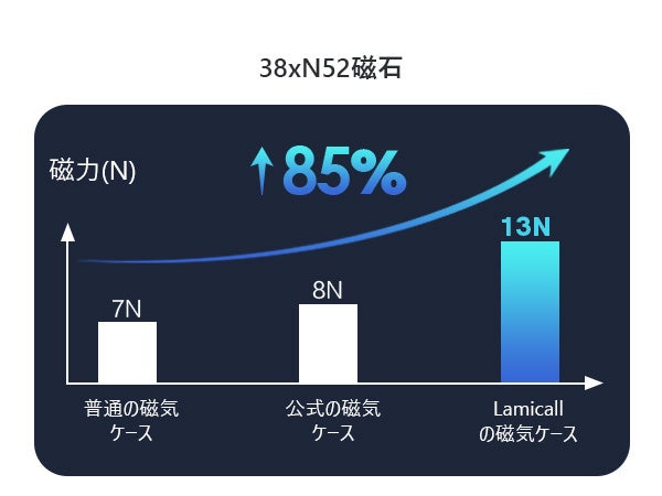 また、本製品のバックパネル部分には上級グレード磁石N52を円形状に36個、直線状に2個搭載しました。一般的な磁気ケースと比較して吸着力が85%アップしております。驚くべきホールド力を発揮しますので、アクセサリー使用時のぐらつきを心配する必要もありません。