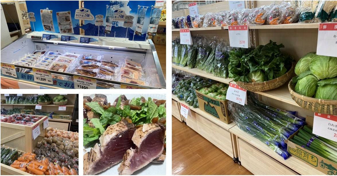 生鮮品やお土産物のほか、JR西日本の荷物輸送サービス「荷もっシュッ!」をはじめ、JR各社の荷物輸送事業と連携し、新幹線で運ばれた鹿児島、福岡など各地の野菜、果物、鮮魚など鮮度抜群の食品を販売します。