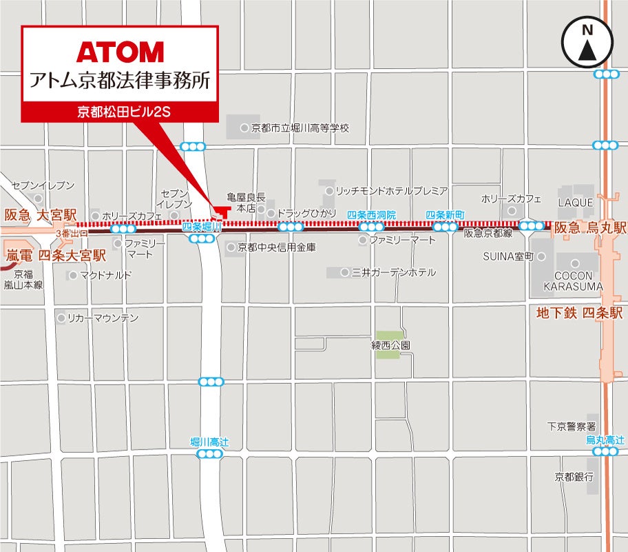 アトム京都法律事務所は、2025年1月7日に開業。京都市内の中心である四条堀川にあります。