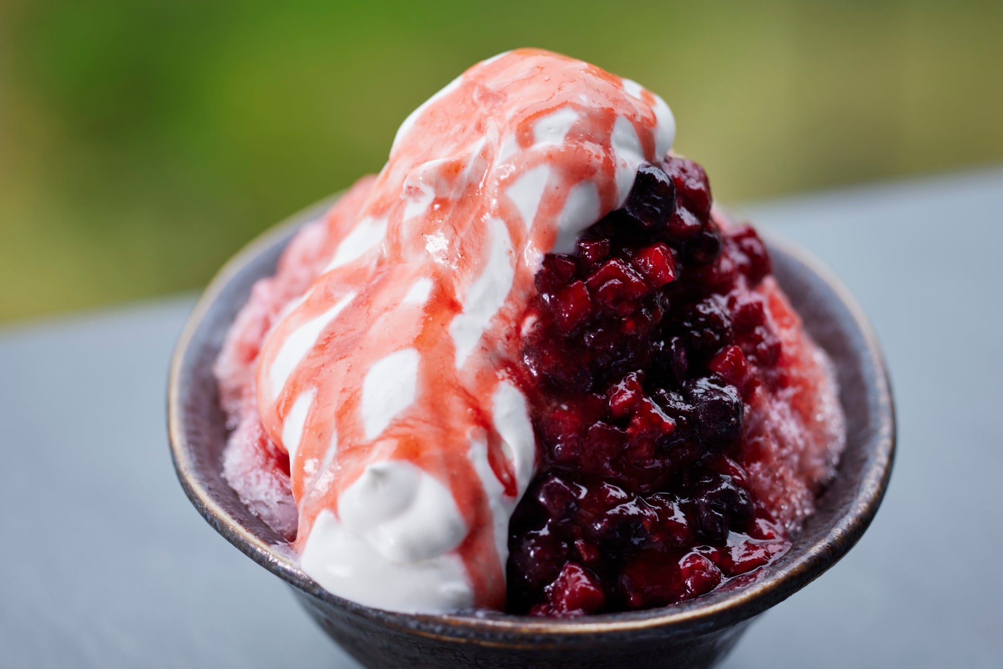 赤富士をイメージした「イチゴ杏仁」は、なめらかな自家製杏仁豆腐をかき氷の中にしのばせ、とろけるような食感が広がります。オリジナル生クリームと足柄牛乳を使用した自家製練乳に、自家製イチゴシロップとミックスベリーを重ねました。ひんやりとした食感の中にまろやかな杏仁の風味が広がり、まるで新感覚のスイーツを味わっているかのようなひとときを演出いたします。