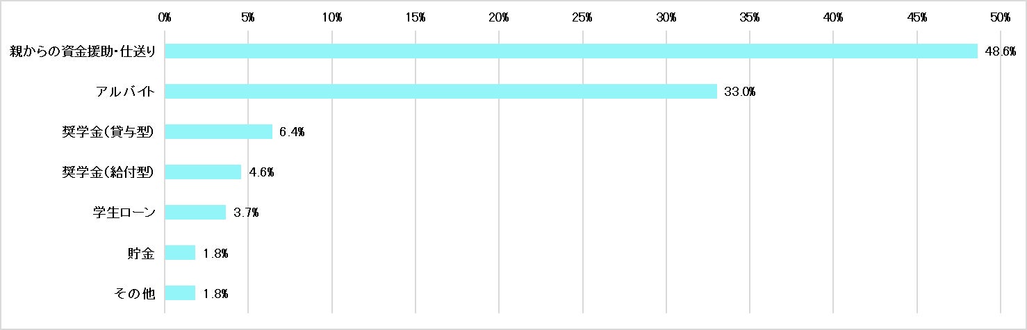 「親からの資金援助・仕送り」が最も多く48.6%となった。次いで「アルバイト」(33.0%)となり、この2つだけで8割強(81.6%)を占める結果となった。奨学金の割合が一番大きいと回答した人は、約1割(貸与型+給付型=11.0%)だった。