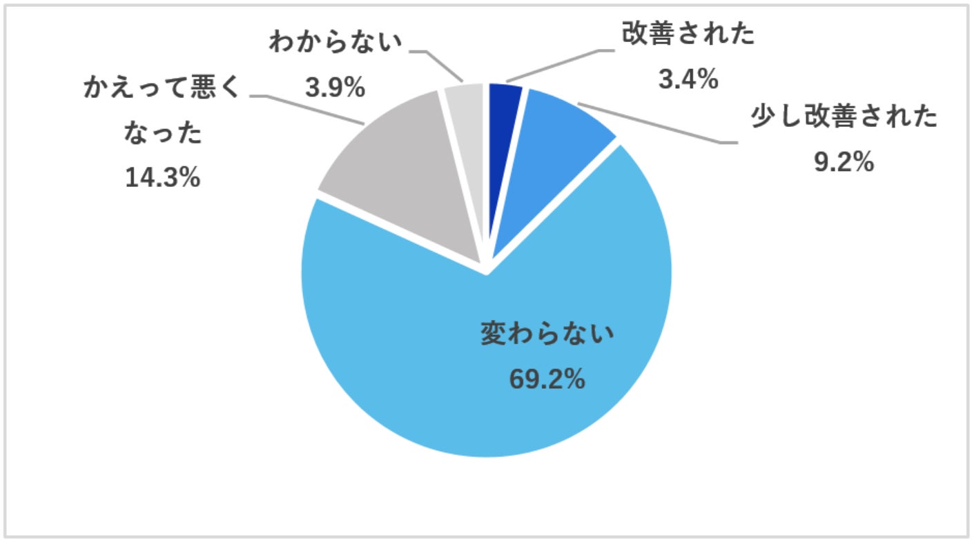 施行前と後では「変わらない」という回答が最も多く約7割(69.2%)に達し、「かえって悪くなった」も14.3%あった。施行から1年以上経った現在、状況が変わっている可能性もあるものの、この時点では楽観的に考える医師は少なかった。