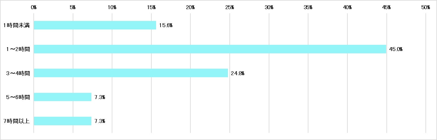 「1~2時間」が最も多く、45.0%となった。次いで、「3~4時間」(24.8%)、「1時間未満」(15.6%)の順となった。医学生は長時間勉強しているイメージがあるが、今回の調査では、「2時間以下」が約6割(60.6%)を占める結果となった。一方で、1日平均5時間以上勉強するという人も14.6%いた。