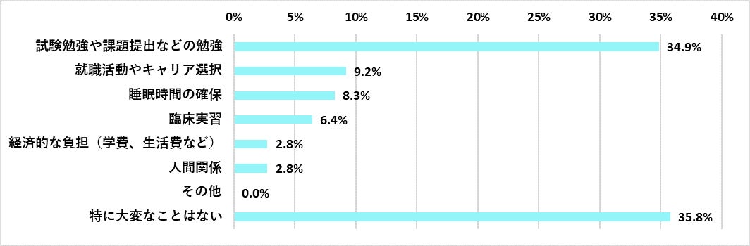 「試験勉強や課題提出などの勉強」が圧倒的に多く34.9%となり、2位以下の「就職活動やキャリア選択」(9.2%)、「睡眠時間の確保」(8.3%)、「臨床実習」(6.4%)を大きく引き離した。一方「特に大変なことはない」も3割強(35.8%)となった。