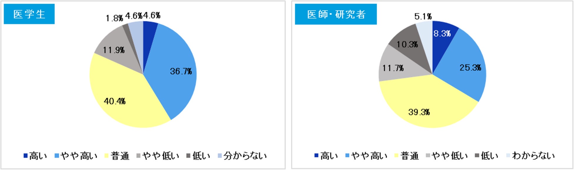 「高い(高い+やや高い)」が4割強(41.3%)となり、2024年12月に当財団より配信した「医師・研究者へのアンケート調査」の、「高い(高い+やや高い)」(33.6%)を上回った。