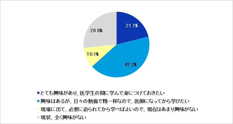 全体では「興味がある」が6割強(63.3%)、「興味がない」が約4割(36.7%)となり、「興味がある」と答えた医学生が多い結果となった。しかしながら、「興味がある」と回答しながら「日々の勉強で精一杯なので、医師になってから学びたい」という人が約4割(42.2%)おり、「医学生の間に学んで身につけておきたい」という積極的な回答は約2割(21.1%)に留まった。