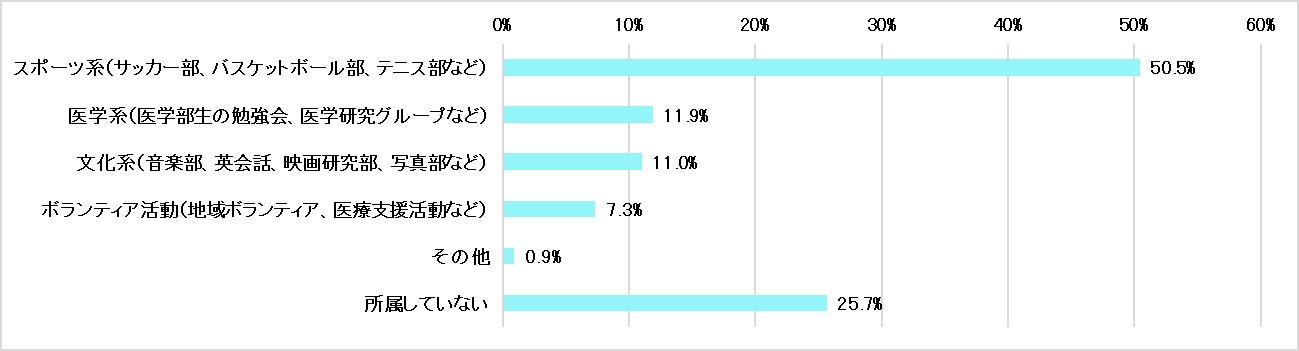活動内容別に見ると、「スポーツ系」が突出して多く半数以上(50.5%)で、医学系(11.9%)、文科系(11.0%)の5倍近い数値となった。
