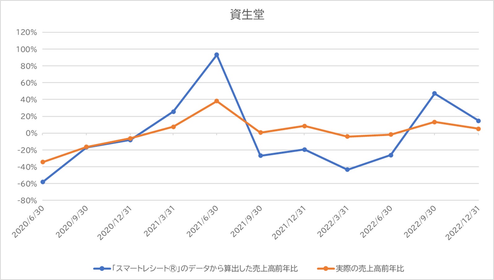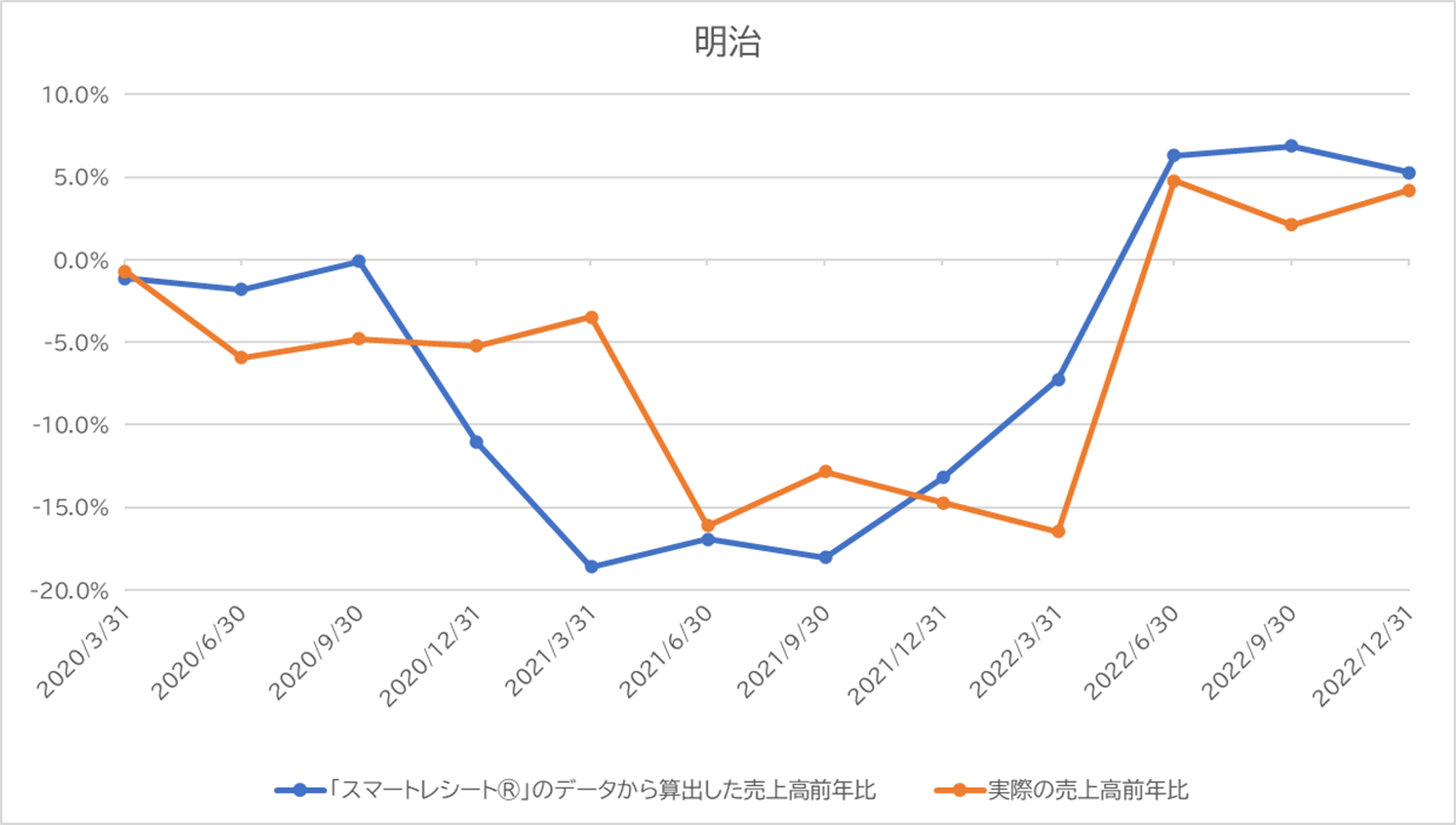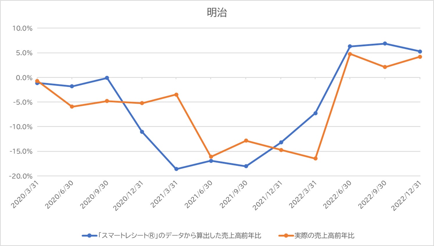 株式会社明治および株式会社資生堂の売上高前年比を、「スマートレシート®」のデータと実際のデータとで比較しました。グラフからは、前者と後者の動きがほぼ連動していることが見てとれます。両社のような食品・日用品メーカーはスーパーやドラッグストア、コンビニエンスストアなど多岐にわたる販売チャネルを持っているため、単一のPOSデータからの売上予測が困難ですが、様々な販売チャネルでの購買行動を捕捉できる電子レシートデータを活用することにより、このような高精度な分析が可能になります。