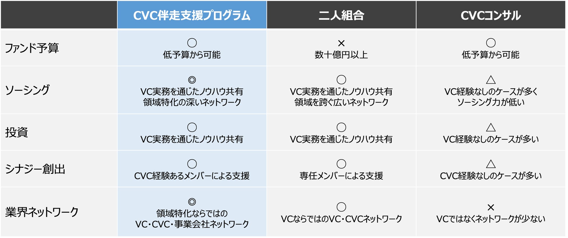CVC伴走支援プログラムは、この領域特化ならではの強みを活かし、従来の二人組合よりも低予算で、実務的なノウハウと業界ネットワークを提供、CVCの円滑な設立・運営を支援します。