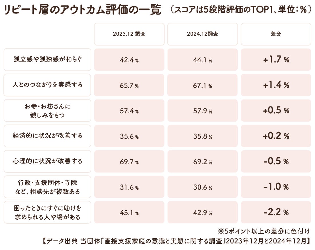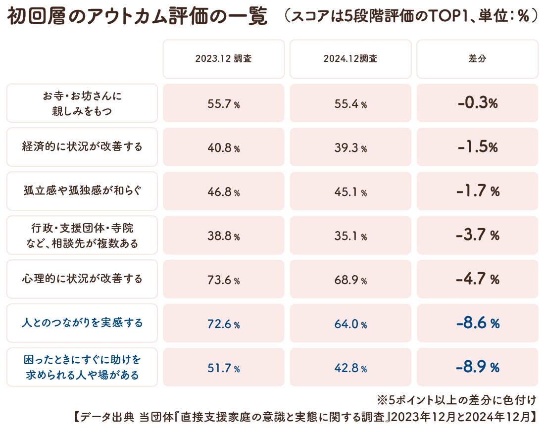 私たちは毎年、おすそわけを受け取った生活困窮家庭を対象に生活状況などをお聞きする調査を行っています。これまでの調査から、初めておすそわけを受け取る「初回層」と、これまでに複数回おすそわけを受け取ったことのある「リピート層」では傾向に大きな差のあることが分かっています。2層に分けて「直接支援家庭向け調査(2024年12月)」のスコアの前年からの変動を見ると、初回層では、初期成果に掲げる「人とのつながりを実感する」が8.6ポイント低下、「困ったときにすぐに助けを求められる人や場がある」指標のスコアが8.9ポイント低下しました。