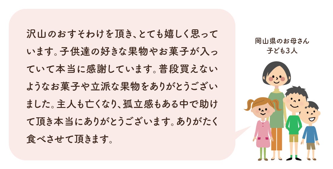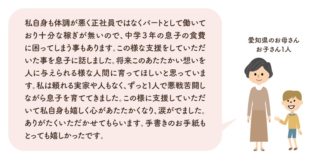 私たちのもとには、自治体や支援団体との連携を通じて支援が届きにくいと想像されるご家庭からの声も寄せられています。その一部をご紹介します。
