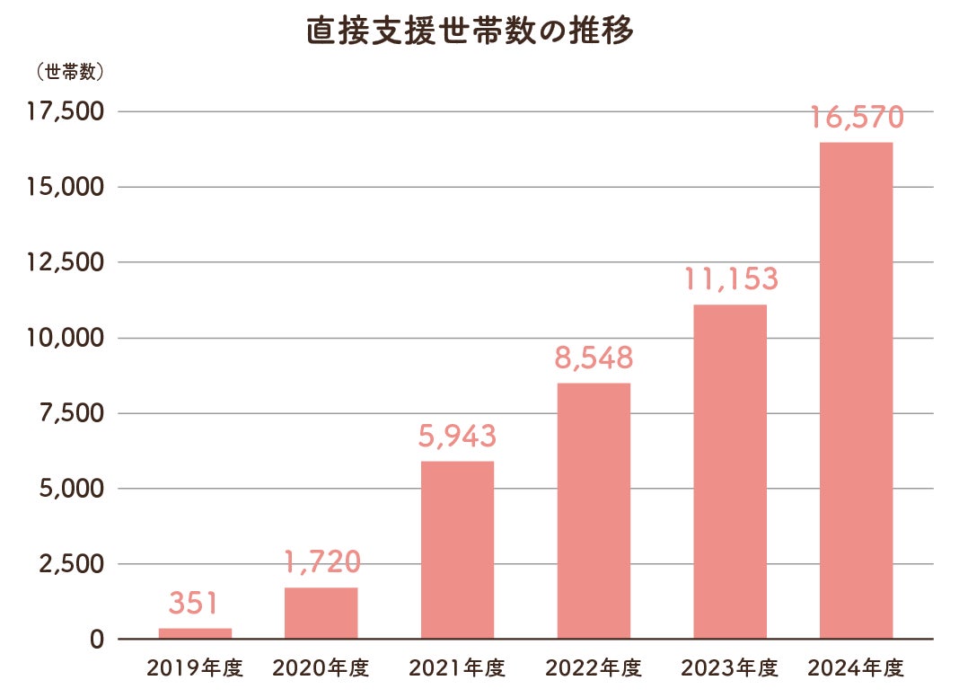 2024年度はおてらおやつクラブと直接的につながり、支援を受ける(以下、直接支援)生活困窮家庭は16,570世帯(前年比148.6%)となりました。