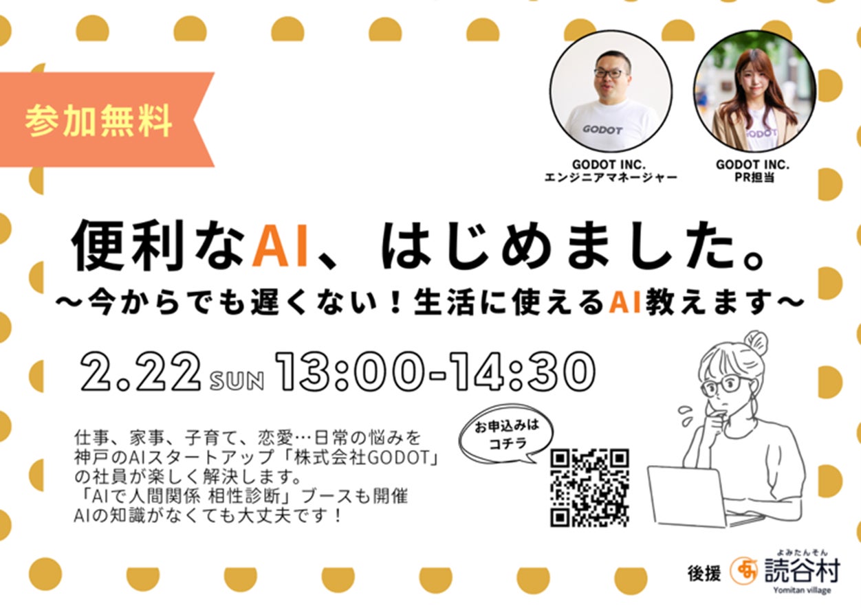 株式会社Godot(ゴドー/兵庫県神戸市、代表取締役 森山 健、以下「Godot」)は2026年2月19日(木)、22日(日)、沖縄県読谷村立図書館(ゆんラボ・未来館)において、AIの技術をわかりやすく伝える体験型イベントを開催いたします。AI体験を通じて、村民が主体的に行政へ関わる機会を広げ、市民科学の基盤づくりにもつなげていくものです。協定2年目となる今年は、AIシミュレーションや行動科学の内製化を加速し、村民主体の行政モデルのさらなる発展に貢献してまいります。