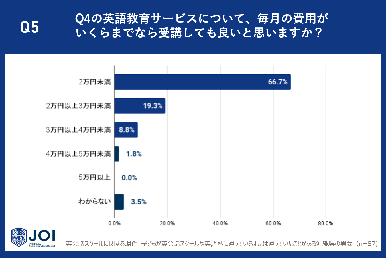 Q4で「受講したい」「料金が安ければ受講したい」「興味がある」と回答した人に、Q5で、「Q4の英語教育サービスについて、毎月の費用がいくらまでなら受講しても良いと思いますか?」と質問したところ、最も多い66.7%の回答者は2万円未満が適切と感じています。19.3%は2万円以上3万円未満、8.8%は3万円以上4万円未満と答えました。対照的に、4万円以上の費用を考える回答者は極少数で、4万円以上5万円未満が1.8%、5万円以上が0.0%でした。これにより、沖縄県では多くの人が3万円未満の価格帯を望んでいることが明らかとなりました。