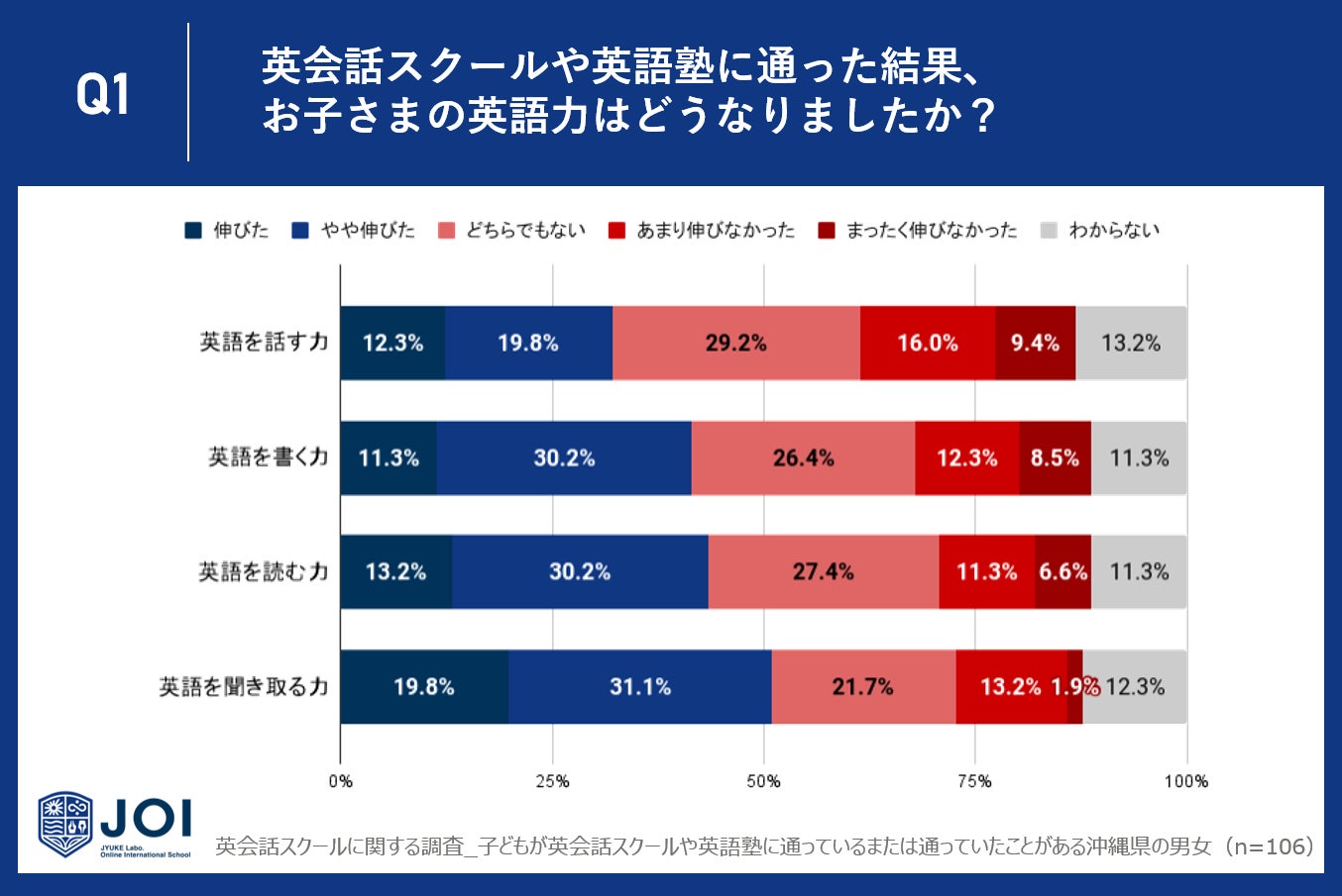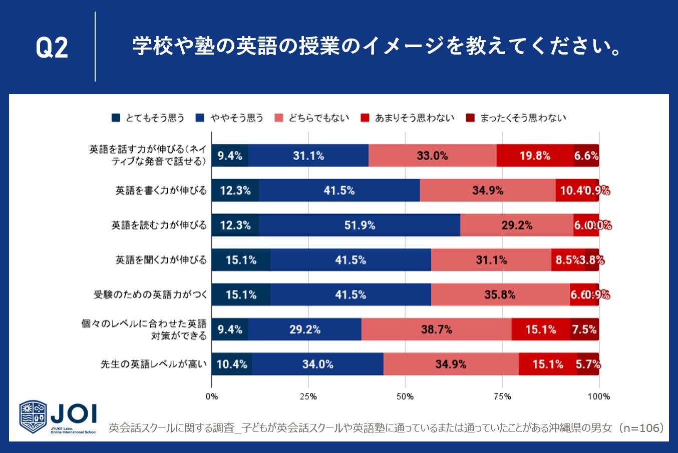 【沖縄県】子どもの英会話スクールに明確な効果を感じなかった人は36.8%~54.7%。学校や塾の英語の授業に対しても35.8%~61.3%の人が明確な効果を感じず。