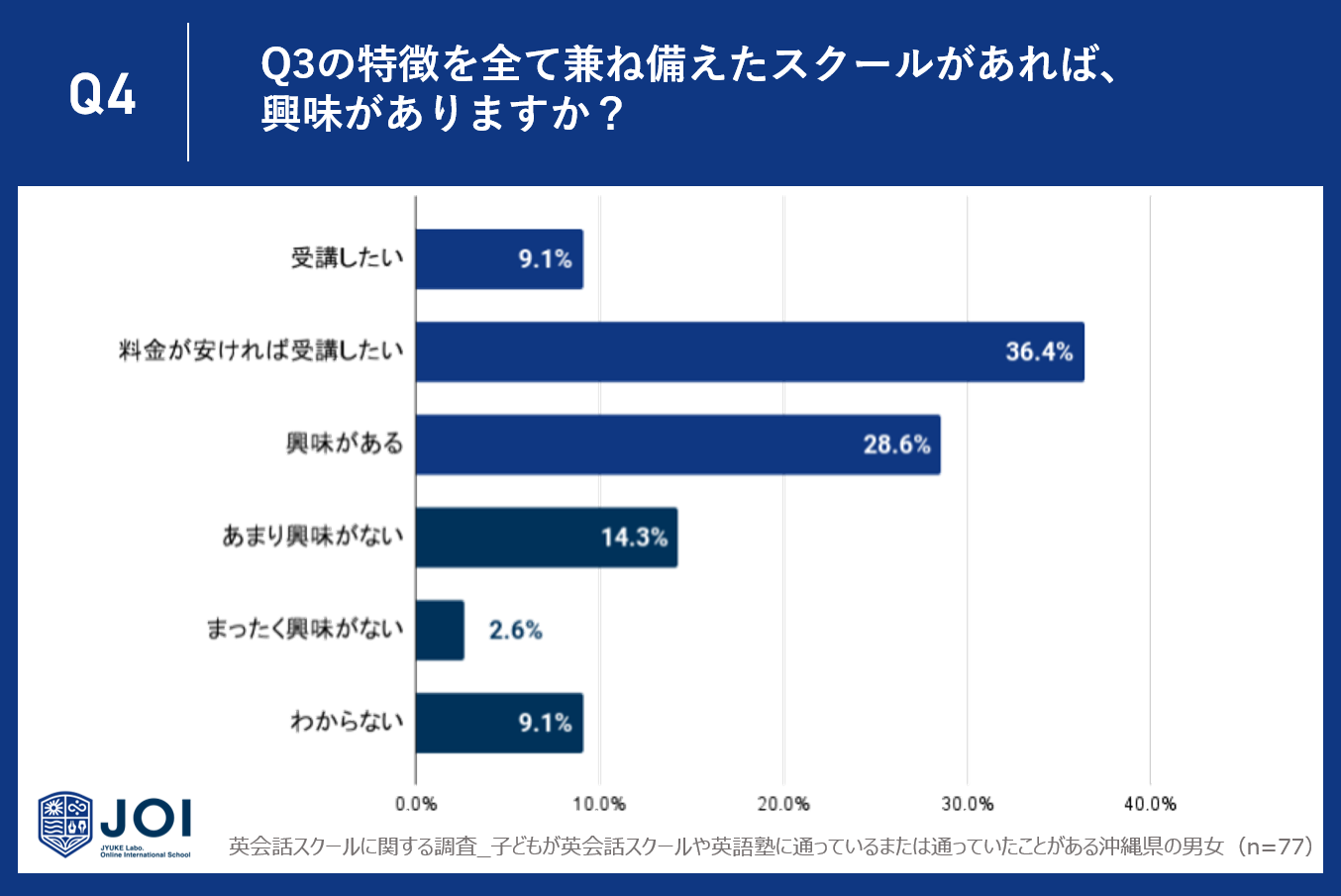 Q4で「Q3の特徴を全て兼ね備えたスクールがあれば、興味がありますか?」と質問したところ、沖縄県では9.1%が受講を希望し、36.4%は料金が手頃であれば受講したいと考えています。さらに、28.6%は興味を示していると回答しました。多くの人がこのような特徴を持つスクールに一定の興味を示していることが分かります。