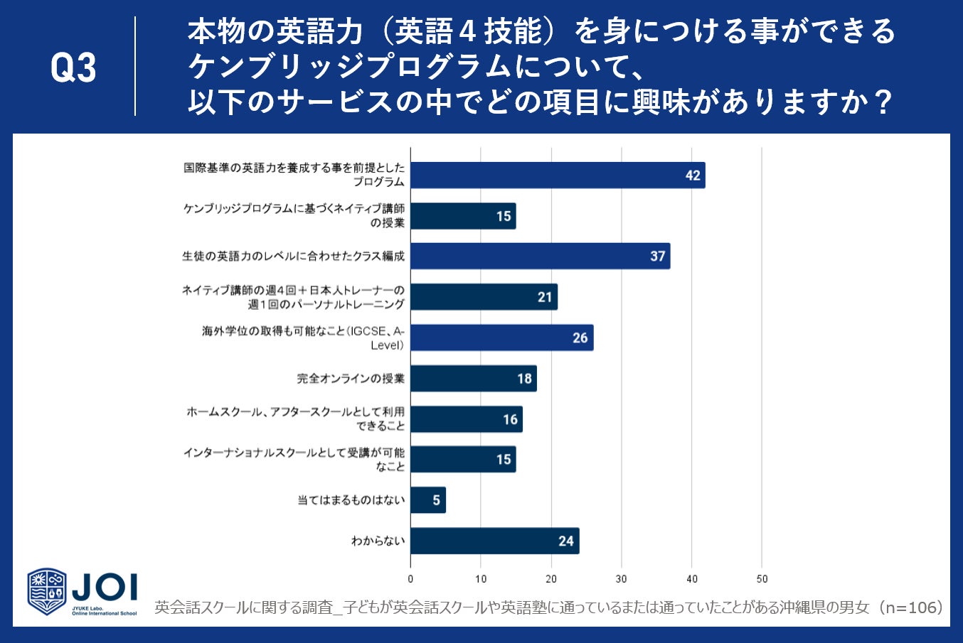 Q3で「本物の英語力(英語4技能)を身につける事ができるケンブリッジプログラムについて、以下のサービスの中でどの項目に興味がありますか?(複数回答可)」と質問したところ、沖縄県で最も多かったのは「国際基準の英語力を養成する事を前提としたプログラム」で42名でした。次いで、「生徒の英語力のレベルに合わせたクラス編成」には37名、「海外学位の取得も可能なこと(IGCSE、A-Level)」には26名が興味を持っています。一方で、「ケンブリッジプログラムに基づくネイティブ講師の授業」や「インターナショナルスクールとして受講が可能なこと」に関心を持つ人はやや少なめで、それぞれ15名、15名の回答でした。これらの結果から、多くの人は実用的な英語力の養成や個別のニーズに応じた指導に重きを置いていることが伺えます。