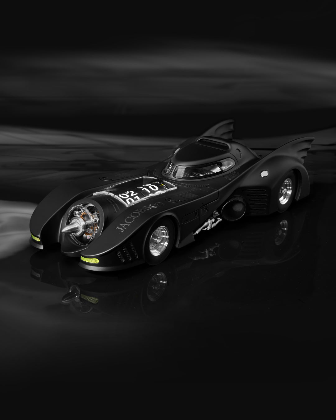 本作はウォッチの設計思想を空間全体へと拡張するために用意された、ゴッサムシティ オーナーが到達できる究極のコレクションを補完する役割を担っています。さらには、ウォッチの存在に依存することなく、バットモービルをモチーフとしたダイナミックな造形だけで、バットマンの美学を鮮烈に提示。書斎やリビングにおいて、それ自体が主役級の存在感を放ちます。