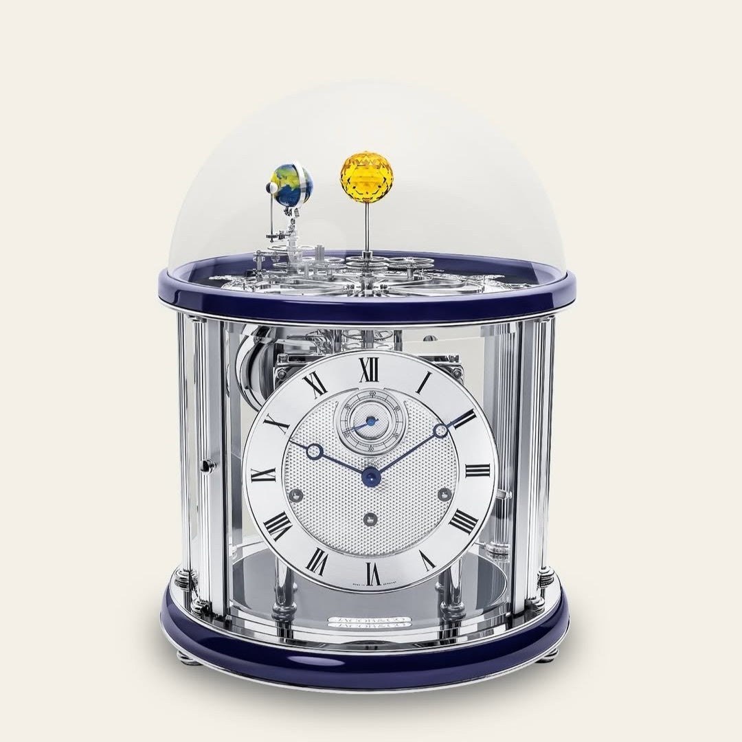ジェイコブ&コーは、アストロノミアの世界観をクロックという形式でも拡張しています。ドイツの名門クロックメーカー、ヘルムレとの協業によって誕生した アストロノミア テラリウムは、太陽・地球・月の相対関係を機械仕掛けで可視化した天体モデルです。4本のアームが中央軸を中心に回転し、時刻表示、天体、そして象徴的なトゥールビヨンが連動する構成となっています。