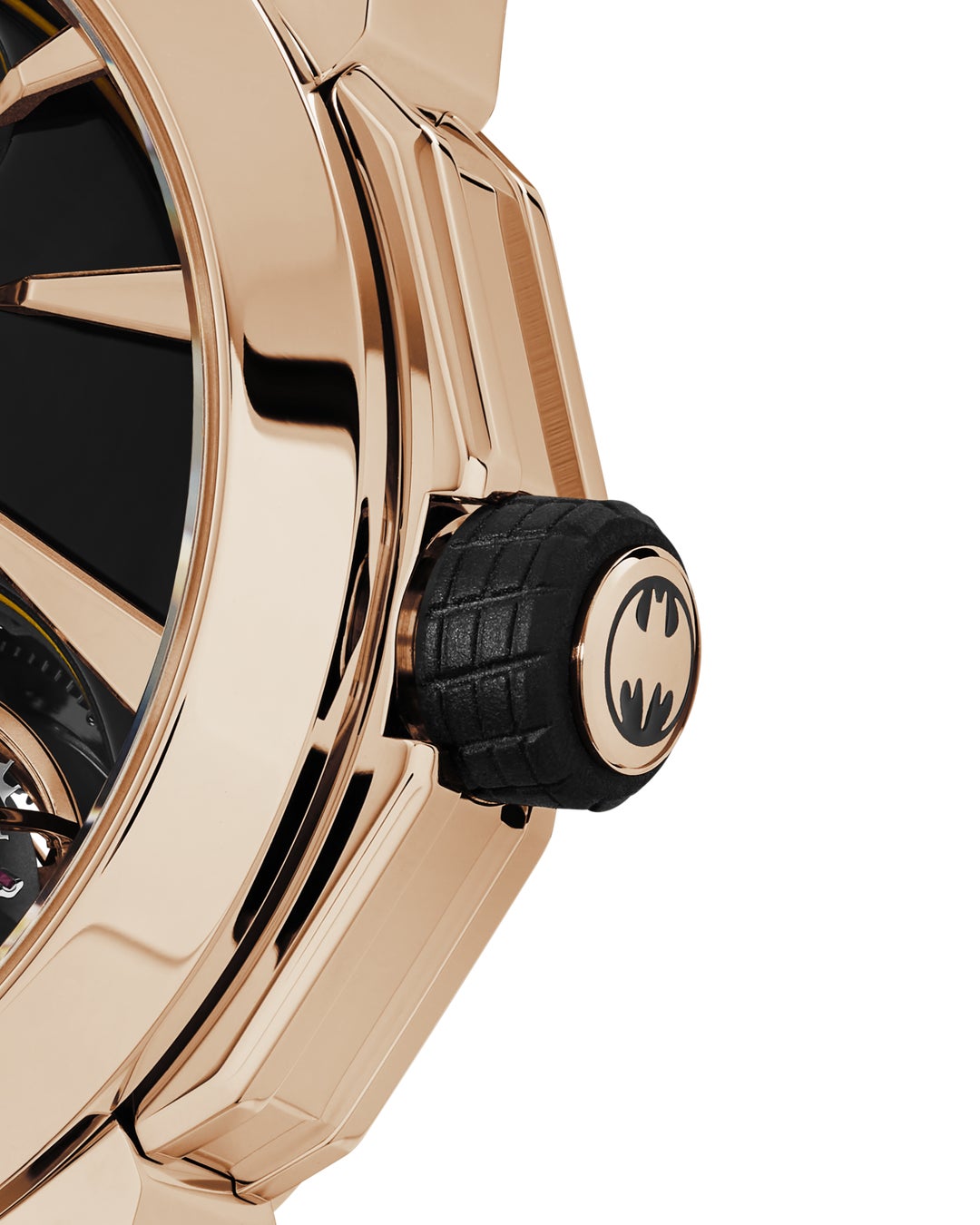 バットモービルのタイヤを模したリュウズも、単なる演出ではなく、巻き上げ機構を司る実用的なパーツとしてケース構造に統合されました。
