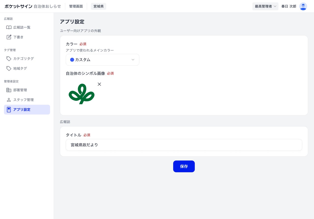 自治体側が使用する管理画面は分かりやすいUIになっており、配信内容を感覚的に入力することができます。また、ブランドカラーやシンボル画像をカスタマイズすることもできるので、各自治体毎のオリジナルアプリのような形で提供する事ができます。