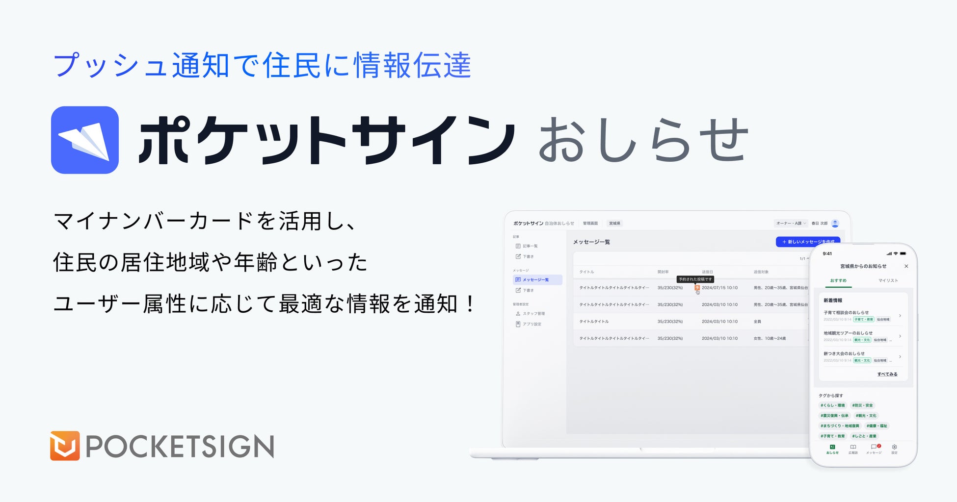 ポケットサイン株式会社(本社:東京都中央区、代表取締役CEO/COO:梅本滉嗣、以下当社)は、地方自治体が広報誌に載せるような情報や公共サービスの案内を、居住地域ごとに住民のスマートフォンへ通知する自治体向けの新プロダクト「ポケットサインおしらせ」を開発しました。まずは宮城県で導入されることが決まっており、順次、全国各地へ展開します。ポケットサインおしらせはマイナンバーカードを活用することで、住民の居住地域や年齢といったユーザー属性に応じて最適な情報を通知できるのが特長です。当社はマイナンバーカードの活用により自治体の様々な業務のDX化を支援してまいります。