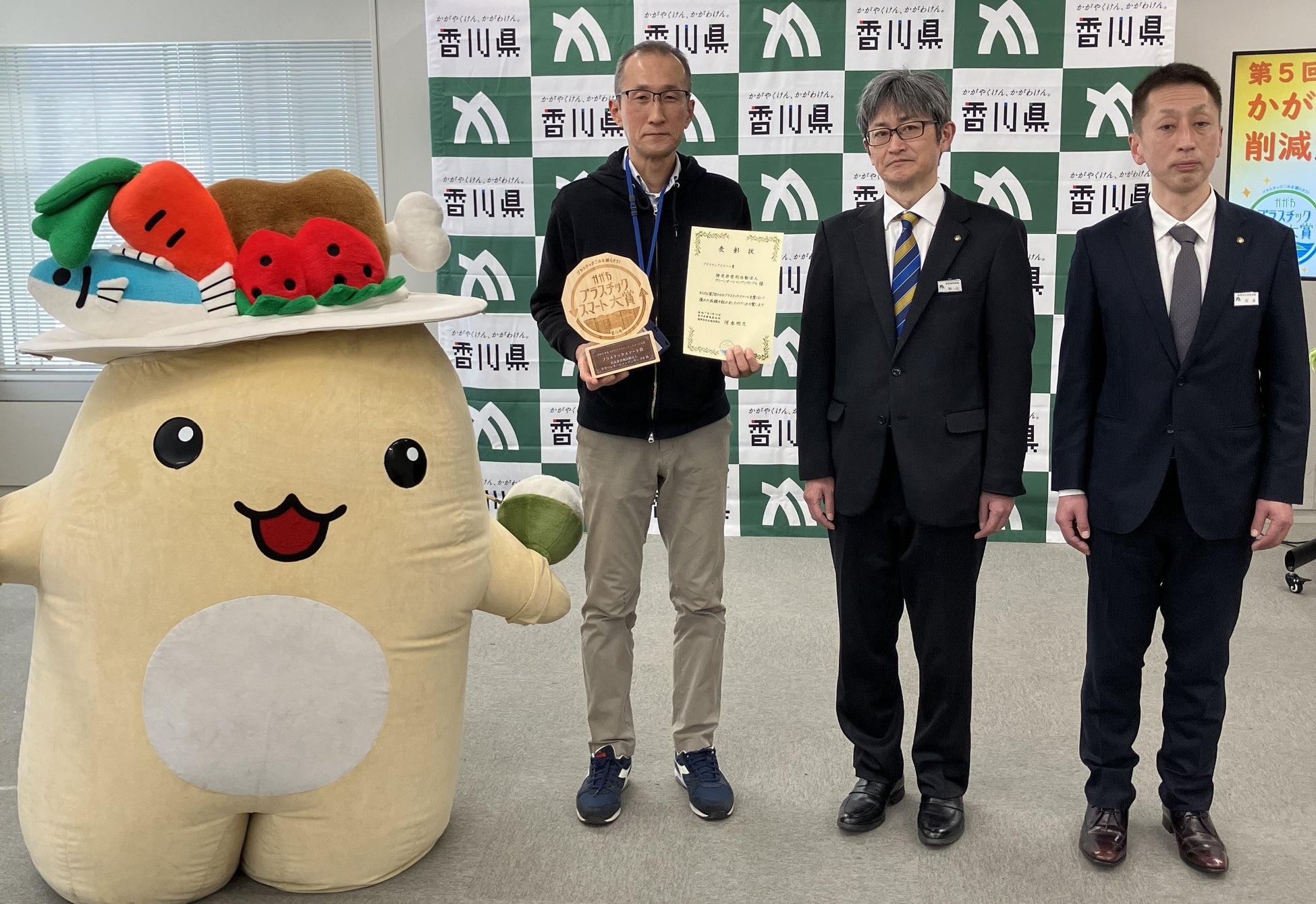 香川県環境森林部の担当者より表彰状が授与され、弊団体理事の田中が優秀賞の盾と賞状を受け取りました。