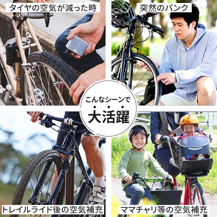 「PumPush(パンプッシュ)」は独自のノズル設計で、仏式・英式・米式バルブに対応しています。クロスバイクやロードバイク、マウンテンバイク、チューブレスバイク、もちろん電動アシスト自転車やママチャリ、子ども用の自転車にも使用できます。