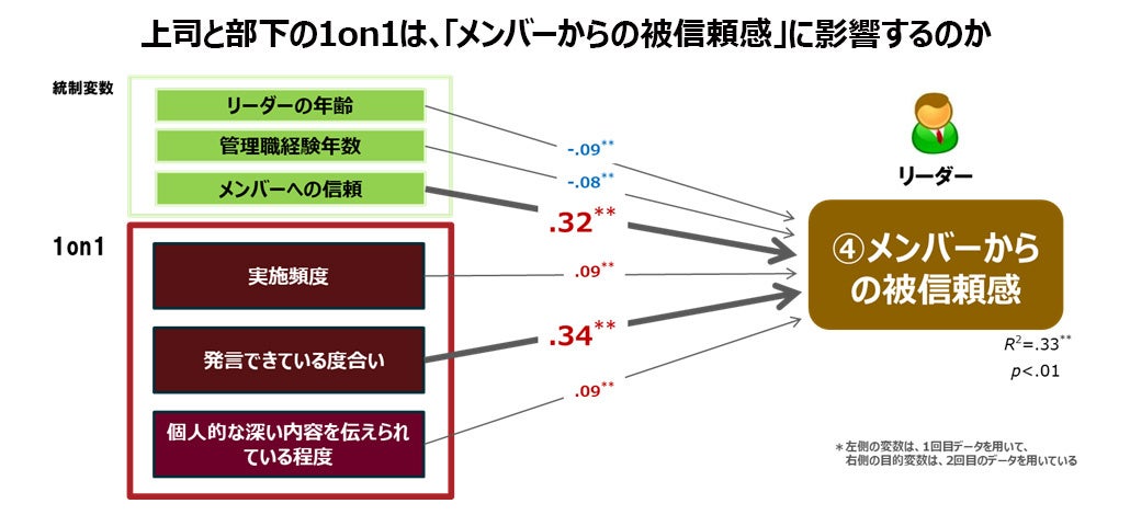これらの結果は、1on1が本来意図している「メンバーのための対話の場」という枠組みを超え、リーダーがメンバーからの信頼を得る契機として機能している可能性を示している。また、こうしたリーダーとメンバーの信頼の双方向性が、最終的に職場全体の信頼関係構築に寄与していると考えられる。
