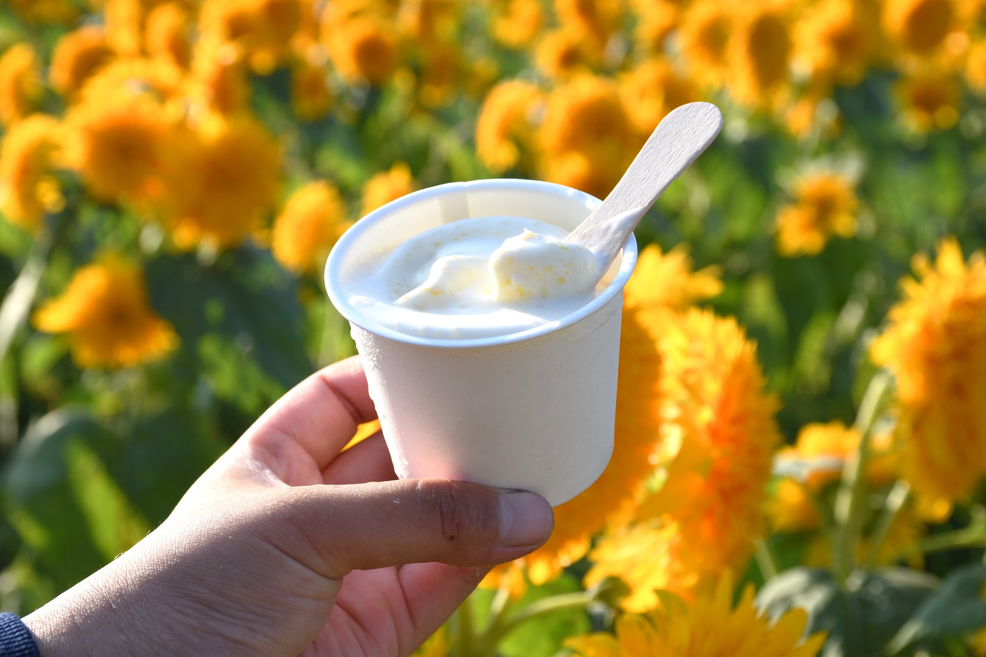 ジェラート工房ドナさんとコラボした絶品「トウモロコシジェラート」を販売します。地元世羅の特産品や、世羅高原農場オリジナルの商品などを販売しています。ひまわりをモチーフにした花雑貨も取り揃えています。